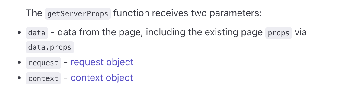 - In the docs it's saying that "getServerProps function receives two parameters". But there are actually described 3 parameters.